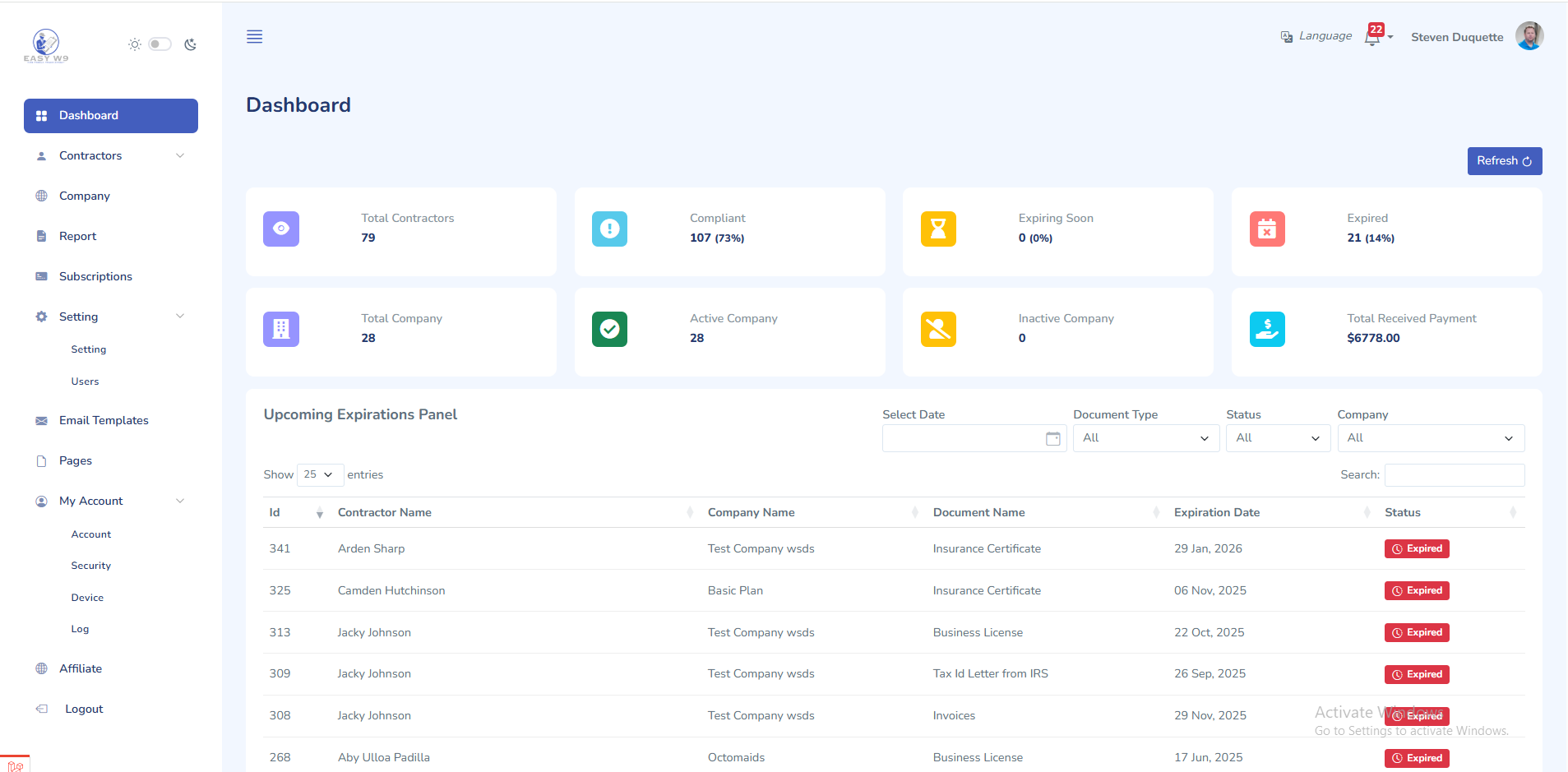 Add, edit, and manage all your contractors in one place with detailed profiles, business information, and real-time status tracking.